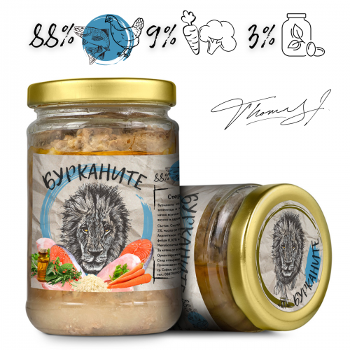 Бурканите са ежедневна храна за домашни зверове. Приготвени са от месо, зеленчуци и хранителни добавки. Готви се в буркан чрез стерилизация. По този начин всички полезни вещества остават в буркана, което прави менюто питателно, вкусно и здравословно. Натурална храна без консерванти, овкусители и оцветители.