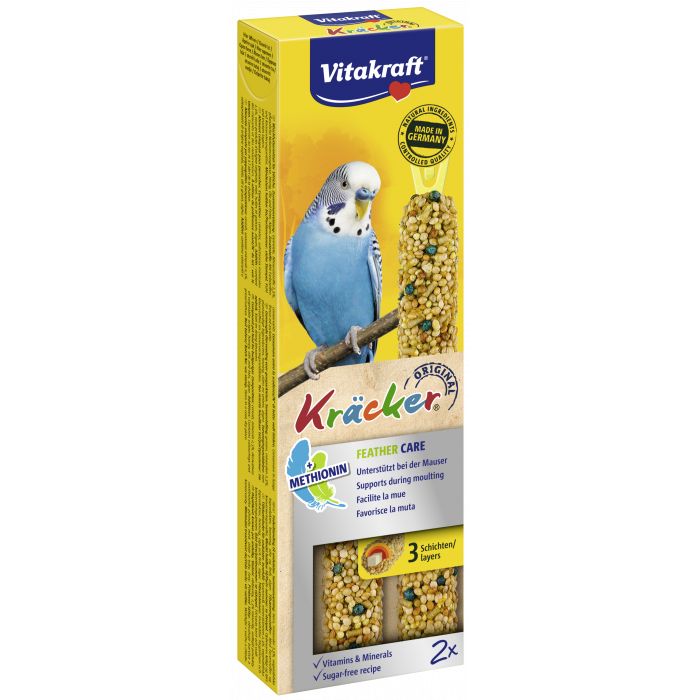 Комбинирана храна за вълнисти папагали. С метионин, витамини и минерали. Рецепта без захар. Произведена в Германия. Контролирано качество. В опаковка, запазваща аромата. Крекерът „Грижа за оперението” на Vitakraft® подпомага процеса на смяна на оперението. Kräcker® e запазена марка на Vitakraft® и представлява три вкусни, изпечени върху естествено дърво слоя, предлагащи изключително дълго удоволствие чрез кълване и подпомагащи грижата за човката.