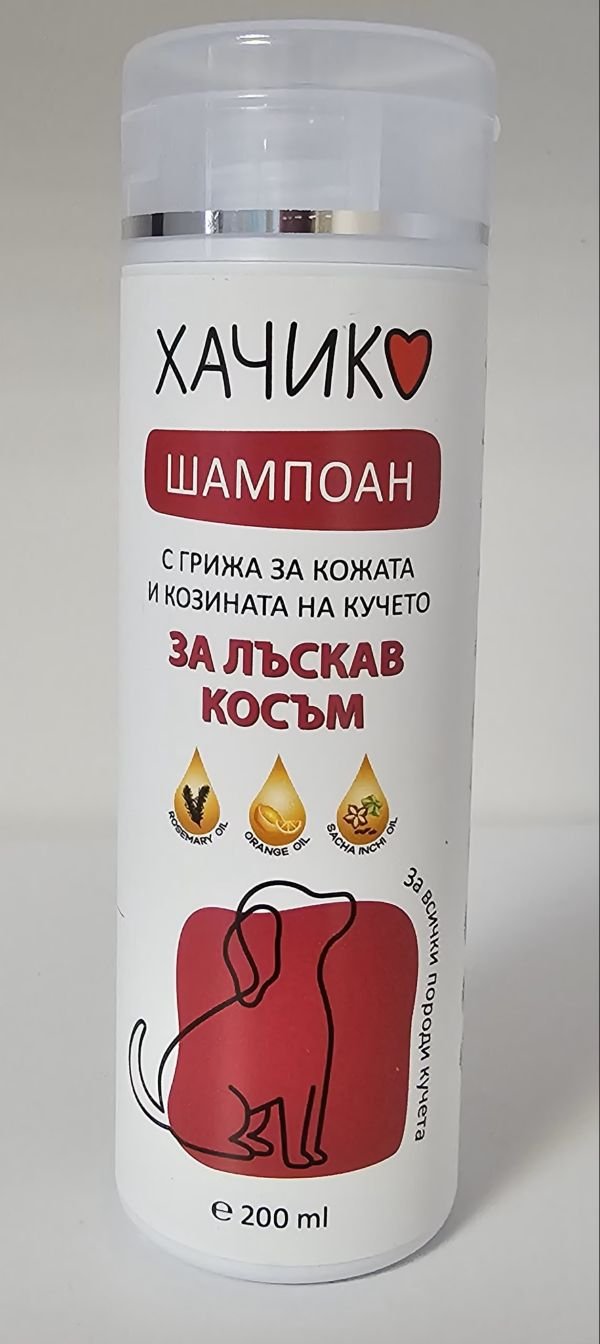 Хачико – Шампоан за лъскав косъм нежно почиства и възстанвява блясъка на космената покривка на вашето куче. Специално подбраните масла стимулират растежа на козината и лесно се абсорбират, превръщайки сухата и изтощена козина в здрава, блестяща и еластична. Шампоанът действа подхранващо на кожата, подобрявайки състоянието на сухата и възпалена кожа, правейки я мека и еластична. Той почиства кожата и поддържа нормалното ѝ рН, без да я дразни.