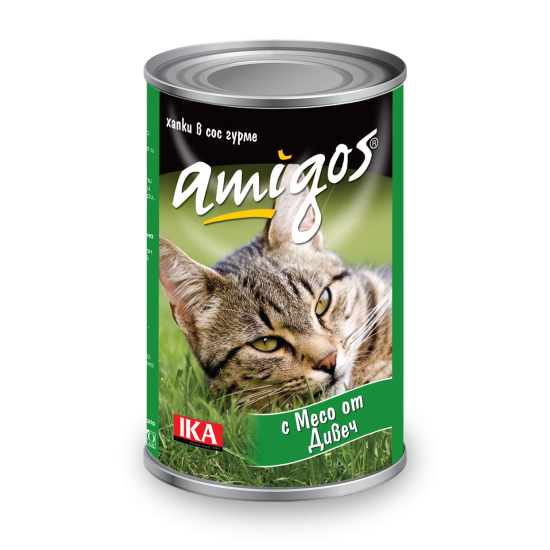 Amigos Game Cat е пълноценна храна с дивечово месо в сос гурме. Тя е подходяща за израснали котки от всички породи, съдържаща витамини и минерали, необходими за оптималното развитие и състояние на вашата котка.