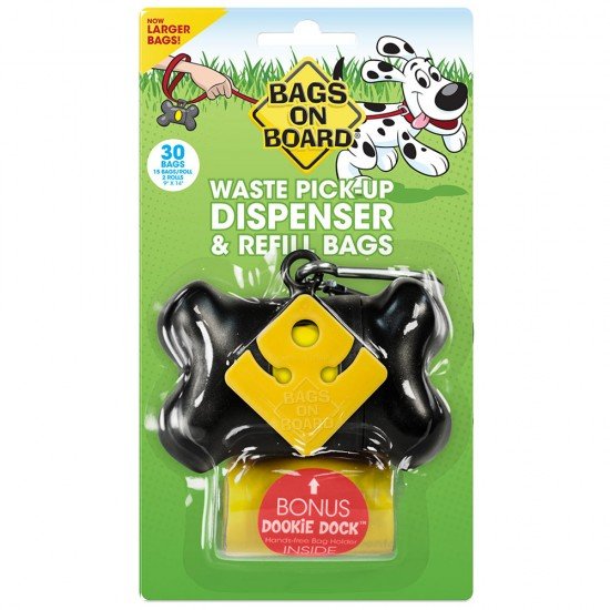 Диспенсер за торбички Bags on Board е във формата на кокал. Можете да го намерите в три цвята – розов, син и черен, като всеки съдържа 30 торбички.