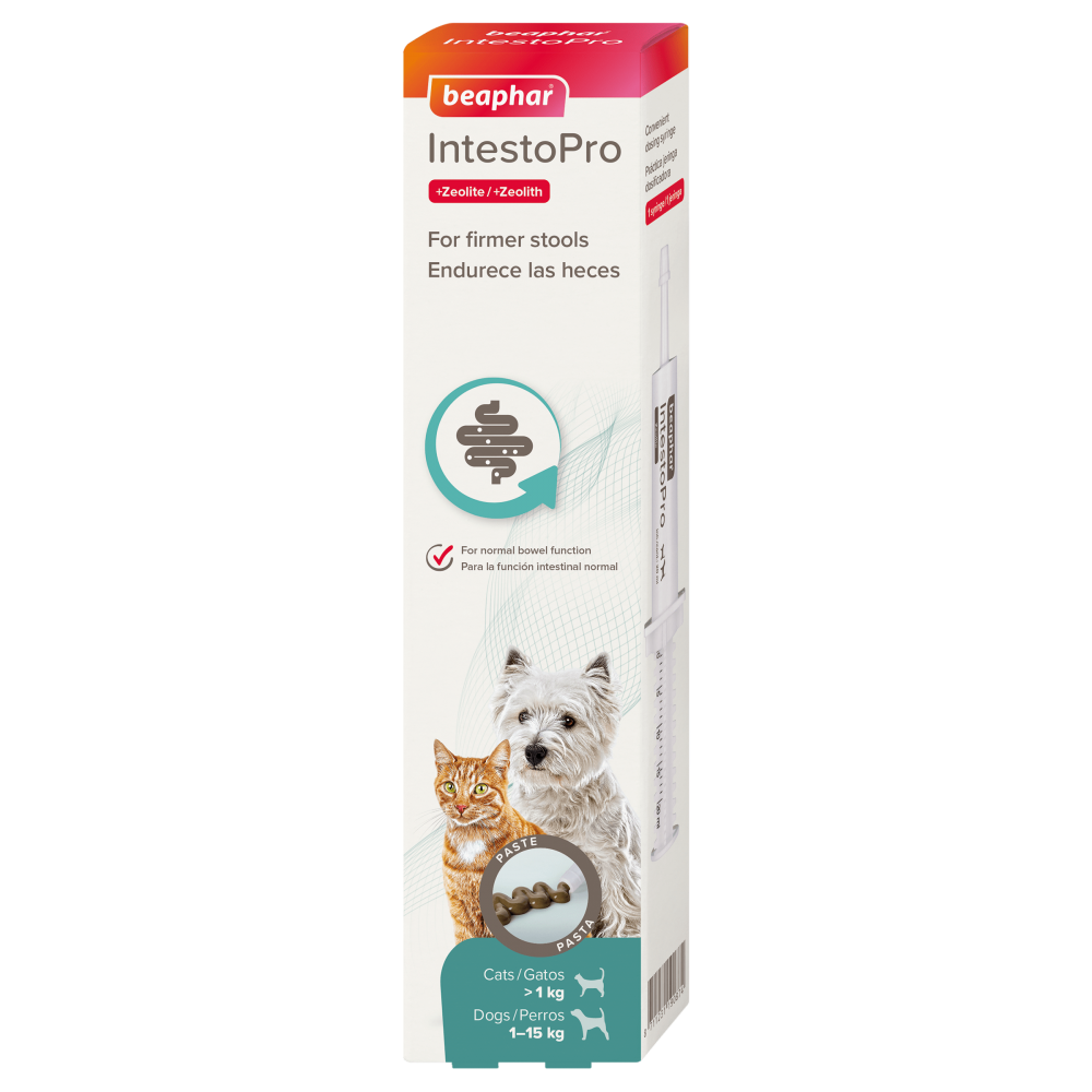 Beaphar IntestoPro паста за котки и кучета помага за облекчаване на чревни проблеми при кучета и котки над 4 седмици и тегло над 1 кг. Подходяща е за всички породи котки с тегло над 1 кг и кучета с тегло от 1 до 15 кг. Основната натурална съставка – зеолитът – спомага за по-твърди изпражнения, като абсорбира излишната влага. Продуктът съдържа още алуминиев хидроксид и FOS и MOS, които са известни със свойствата си да подобряват чревната функция и да укрепват чревната флора. Пастата е много подходяща за котки и кучета с нестабилен стомахили редки изпражнения. В удобна дозираща спринцовка, за директно приложение в устата.
