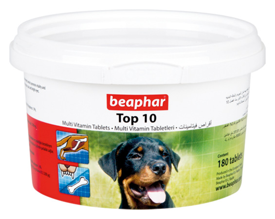 Витамините, минералните соли и микроелементите повишават жизненият тонус и съпротивителните сили на организма. Top 10 подпомага правилното развитие на скелета и зъбите на младите кучета, придава пищност на козината и блясък на очите. При по-възрастните кучета Top 10 способствува за запазване на бодростта и гъвкавостта им. Съдържащият се в таблетките L-carnitine укрепва мускулатурата.