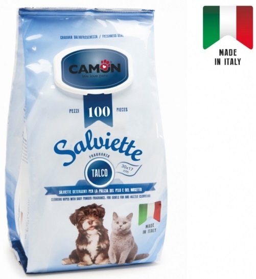 Влажни Кърпи с дълготраен аромат на талк . Подходящи за сухо почистване , всеки път когато не искаме да ползваме вода. Премахва миризмите, почиства и предпазва козината.