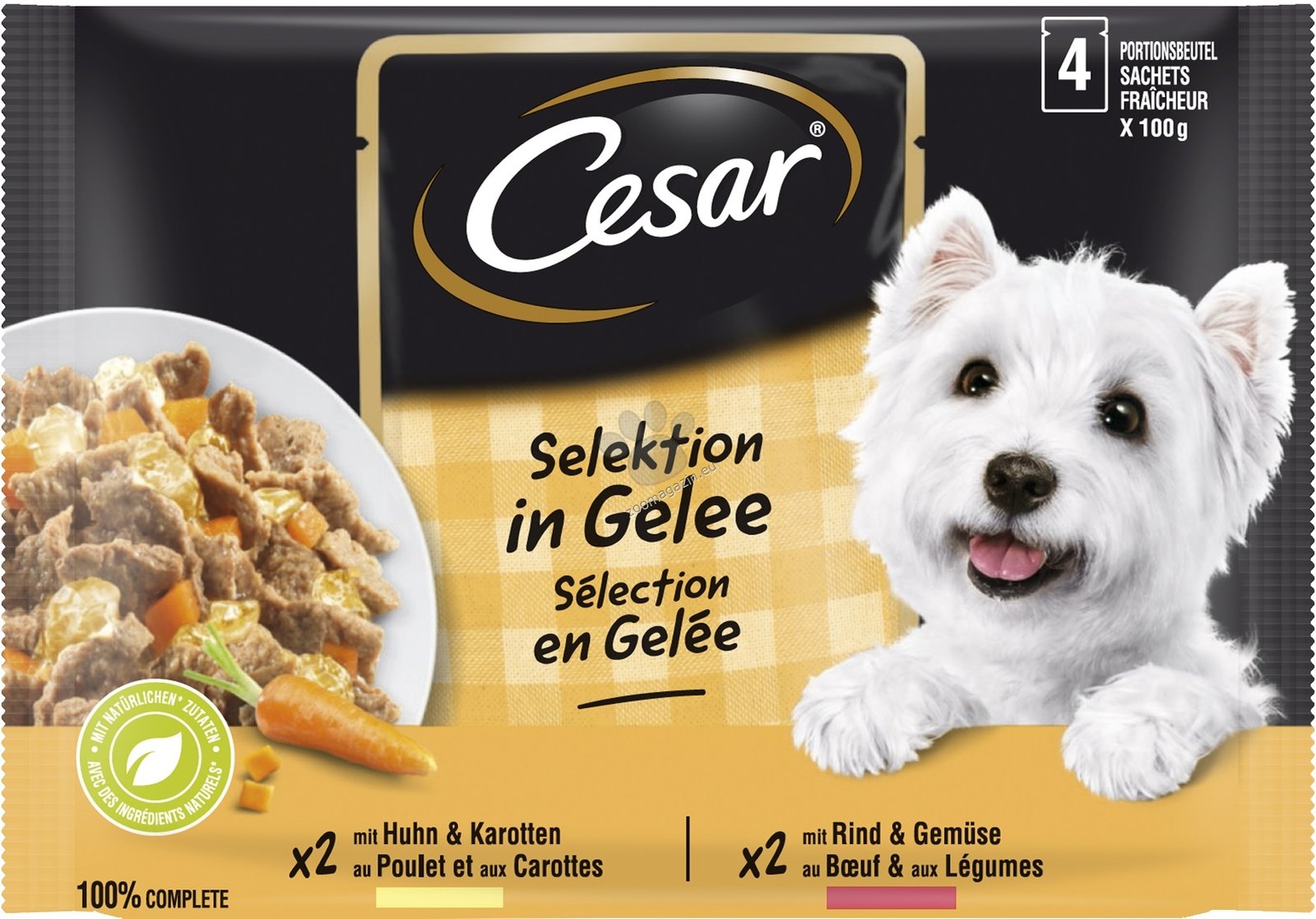 Храната Cesar Selection in Jelly месо и зеленчуци в желе осигурява на вашия любимец всички важни хранителни вещества, от които се нуждае ежедневно. Наред с другото, тя съдържа и ценни витамини и минерали. Тя е без добавена захар и изкуствени оцветители и аромати. В нея влизат само подбрани съставки. Консервираната храна се произвежда по щадяща технология, за да се запазят възможно най-добре естествените хранителни вещества и аромати на суровините.