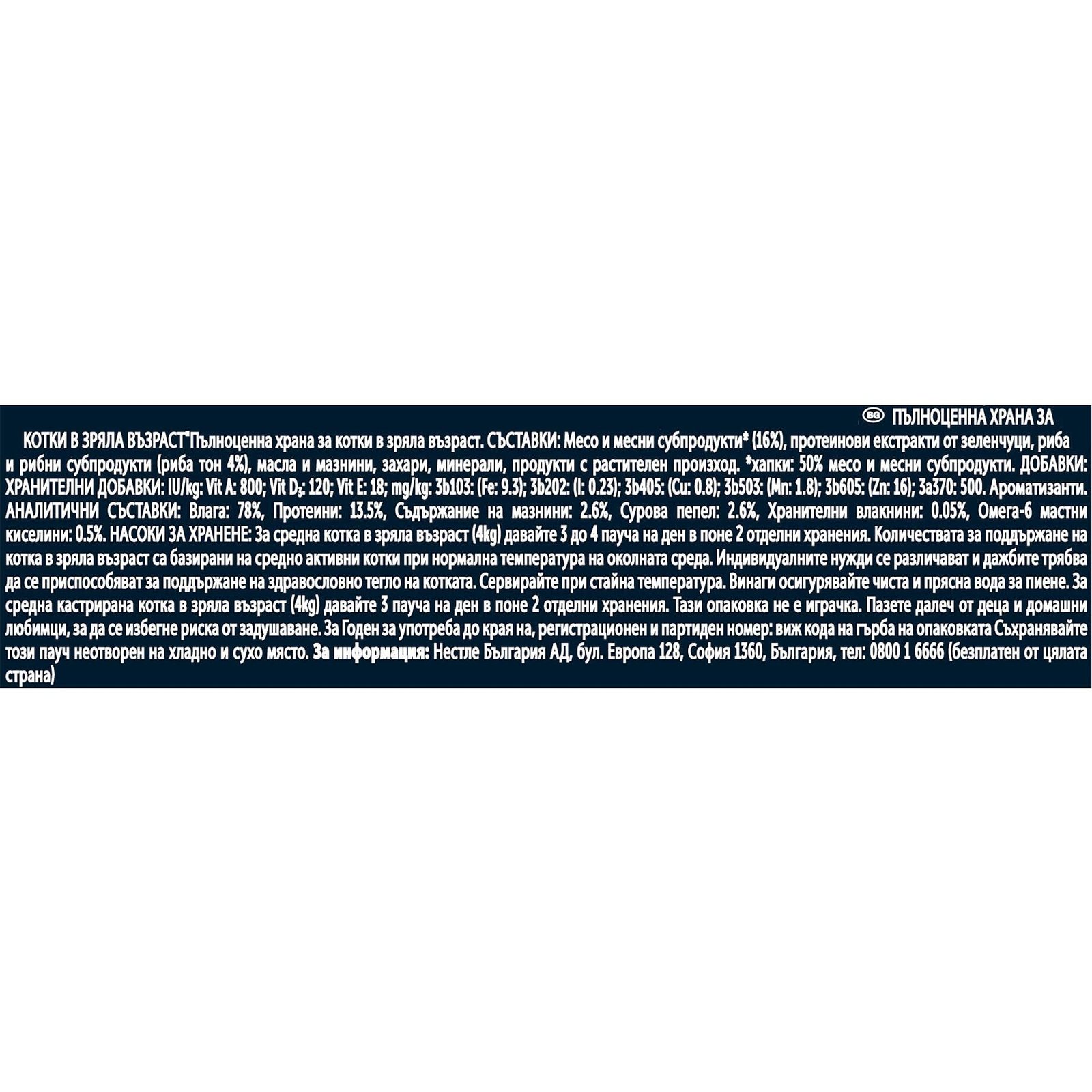 За котка в зряла възраст със средно тегло (4 кг), давайте 3 – 4 пауча на ден с поне 2 отделни хранения. Препоръчителните дневни дажби са базирани на котки с умерена активност, намиращи се в нормални температурни условия. Индивидуалните нужди варират и количествата храна трябва да се коригират съответно, за да се поддържа нормално и здравословно тегло на котката. Да се сервира на стайна температура. Винаги осигурявайте прясна и чиста вода за пиене. За кастрирана котка в зряла възраст със средно тегло (4 кг), предложете 3 пликчета на ден с поне 2 отделни хранения.