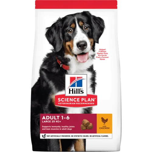 Храната Hill’s Science Plan Large Breed Adult с пилешко е специално формулирана да посреща енергийните нужди на кучетата от едри породи в разцвета на годините им. Приготвена от висококачествени, лесносмилаеми съставки. Поддържа ставите с глюкозамин и хондроитин. Омега-6 мастни киселини и витамин Е за красива кожа и козина. Висококачествен протеин за чиста мускулна маса.