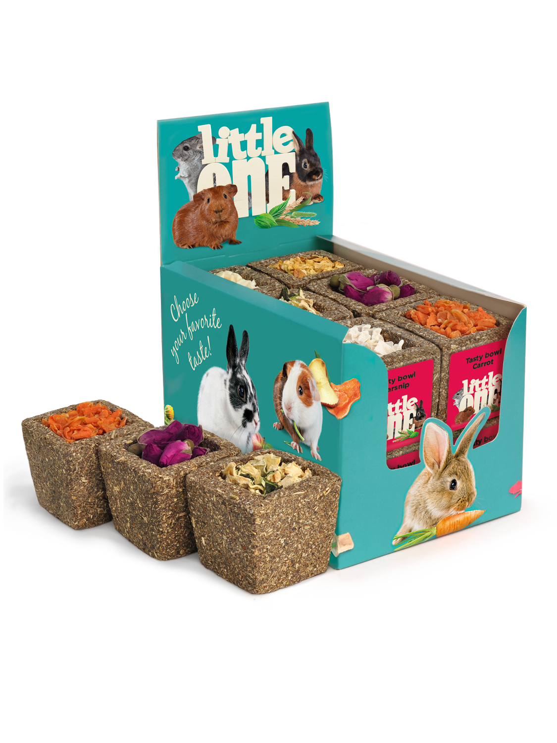 Вкусната купичка е лакомство-играчка, която е разработена специално за гризачи и зайци. Направена е от ароматни ливадни треви и е изпълнена с една от шестте вкусни и полезни съставки: пащърнак, тиквички, ябълка, тиква, морков или рози. Тази играчка ще забавлява вашия домашен любимец за дълго време и ще служи като инструмент за грижа за зъбите. Освен това е перфектен източник на витамини, минерали и фибри, необходими за правилното храносмилане на гризачи и зайци.