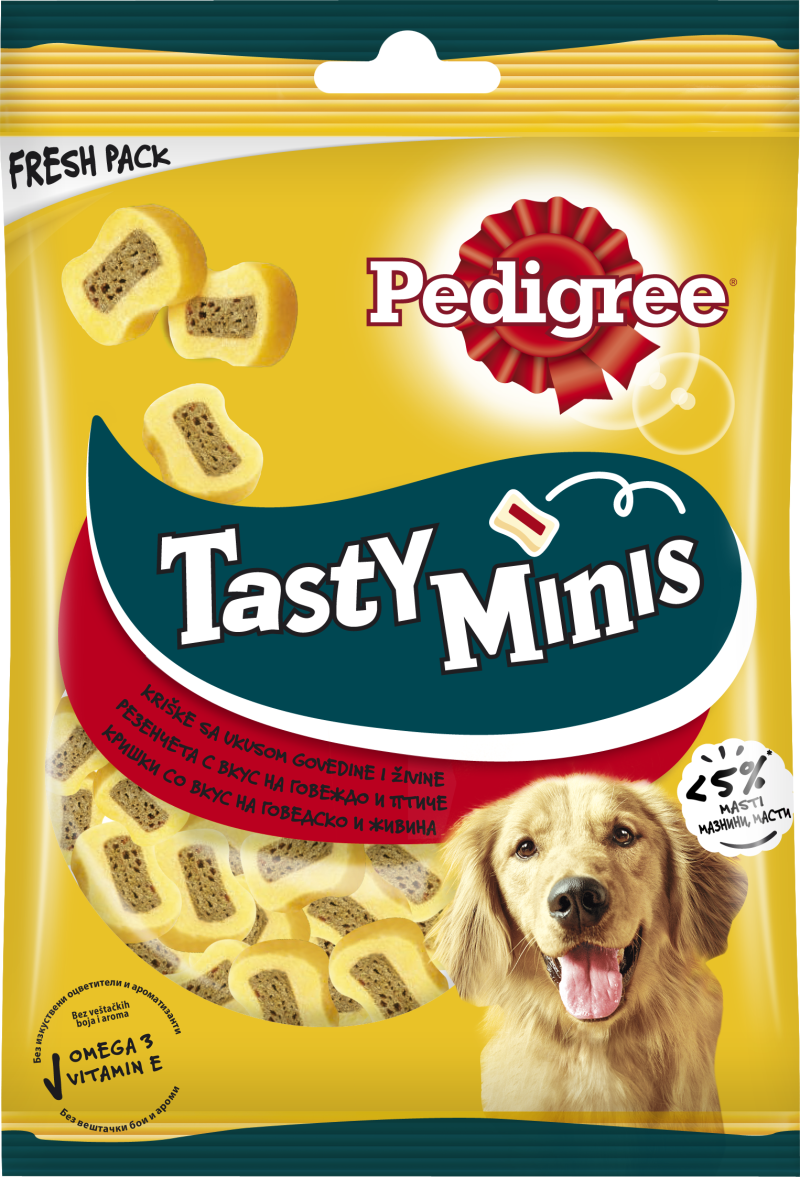 Pedigree Tasty Minis – това са деликатесни лакомства с апетитно говеждо месо. Благодарение на големина си, те са много подходящи да се дават на кучето като малка награда по време на ежедневните тренировки или просто като разнообразна закуска помежду храненията. Малките хапки са богати на полезни витамини, минерали и незаменими омега-3 мастни киселини, които могат да помогнат, както за укрепване на имунната система, така също и за поддържане на здрава кожа и козина на кучето. За да се съхрани естествения вкус, в състава на това лакомство не са добавяни изкуствени оцветители и аромати. Благодарение на практичната, затваряща се опаковка хапките се запазват по-дълго време свежи и вкусни.