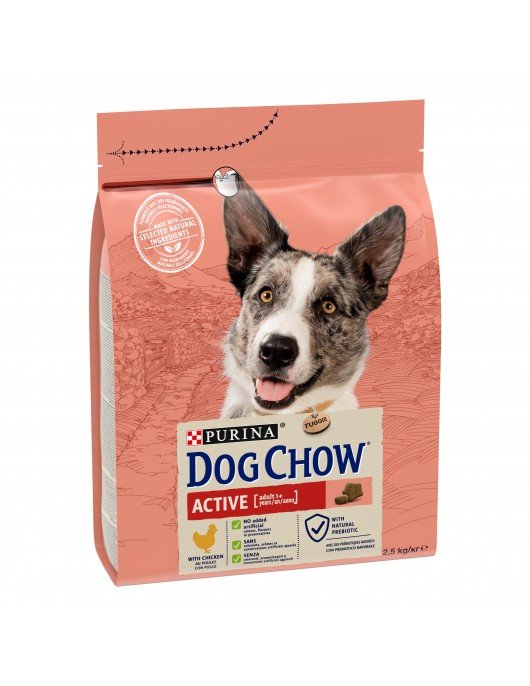 DOG CHOW® Adult Active съдържа всички хранителни съставки, от които едно активно куче се нуждае, за да бъде във форма, здраво и силно. Ако кучето прекарва целия ден в тичане, то се нуждае от хранителни порции, които ще възстановят всички изразходвани калории.