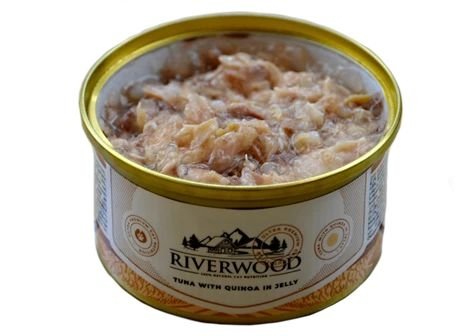 Състав: риба тон 51%, киноа 4,1%, растителен желатин 0,75%. Аналитични съставки: Влага 85,0% Сурови мазнини 1,0%, Суров протеин 12,5% Сурови влакнини 0,5%, Пепел 0,8% Начин на употреба: До 2 кутии на ден, заедно със суха храна Riverwood Сервирайте на стайна температура.