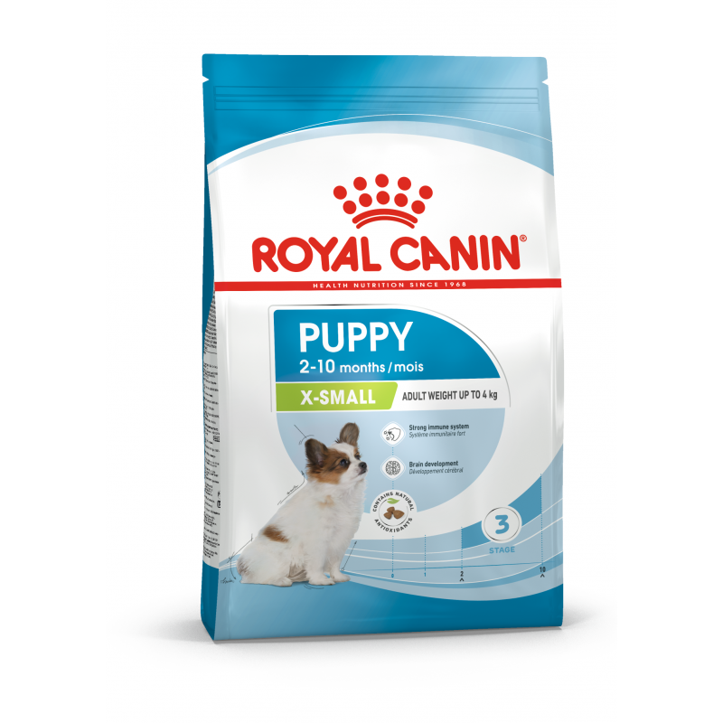 ROYAL CANIN® X-Small Puppy е специално формулиран да поддържа хранителните нужди на кученцата от миниатюрни породи. Тази формула е подходяща за кученца на възраст от 2 до 10 месеца, които в зряла възраст трябва да достигнат тегло до 4 кг. Тази индивидуализирана диета е обогатена с омега-3 мастни киселини (като DHA), за които е научно доказано, че подпомагат здравословното развитие на мозъка при кученцата. Благодарение на комбинацията от полезни пребиотици (като фрукто и мано-олигозахариди и пулп от цвекло) и високоусвоими протеини, ROYAL CANIN® X-Small Puppy също помага за поддържане на здравословен баланс на чревната микробиота (чревна флора) за добро храносмилане. Тази формула съдържа и хранителни вещества като витамин С и Е, за които е доказано, че подпомагат естествената защита на кученцата, докато имунната им система все още се развива. Освен това тази храна има оптимално енергийно съдържание, предназначено да задоволи високите енергийни нужди на бързо растящите кученца от миниатюрни породи. ROYAL CANIN® X-Small Puppy е специално проектирана за изключително малката челюст на вашето кученце, което я прави лесна за вземане и дъвчене. Тя също така помага за поддържане на здравето на зъбите, благодарение на механичния ефект на четкане, докато вашето кученце дъвче. Когато кученцето ви навърши 10 месеца, то ще се нуждае от храна, специално адаптирана да отговори на хранителните му нужди в зряла възраст. На този етап можете да преминете към формулата ROYAL CANIN® X-Small Adult.